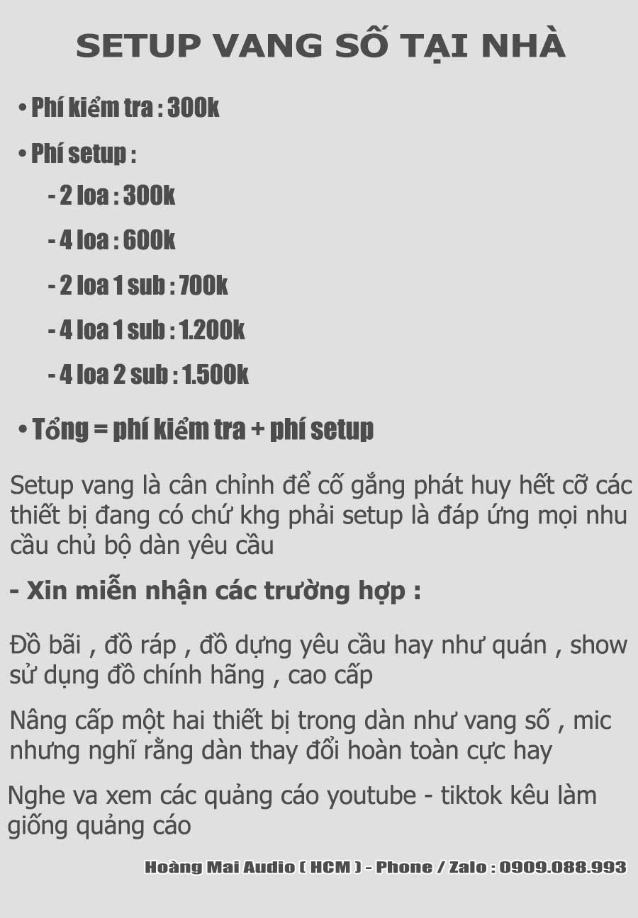 Trang chủ Sản Phẩm Karaoke Vang Cơ - Vang số - Mixer Cân chỉnh , setup vang số tại nhàCân chỉnh , setup vang số tại nhà✓ Hàng Chính Hãng ... ✓ Giá Tốt ... ✓ Giao Hàng Toàn Quốc .500k ➠ 5.000k [ K/Mãi ] ➠ [ ☎ ] Tình trạngXuất xứBảo hành ➢ TP HCM tùy cấu hình Gói setup , chỉnh tại nhà chia làm 2 phần1 - kiểm tra tổng thể thiết bị phí là 300k 2 - tiến hành setup nếu các thiết bị hoạt động tốt , phí setup sẽ dựa vào cấu hình bộ dàn ➠ 2 loa : 500k -> 800k➠ 2 loa 1 sub : -> 1000k➠ 4 loa 1 sub : -> 1500k➠ 4 loa 2 sub : -> 1700k ➢ Ngoài TP HCM : liên hệ➢ bảo trì , setup quán karaoke kinh doanh : liên hệ ➠ Giá ưu đãi đặc biệt cho khách hàng , doanh nghiệp , dự án 💬 Chat Zalo 1Hỗ Trợ - Đặt Hàng Qua Zalo - Giá Tốt Nhất 💬 Chat Zalo 2Số Lượng Nhiều - Kinh Doanh Sỉ Hoàng Mai Audio - HCM nơi bán Cân chỉnh , setup vang số tại nhà giá tốt , hàng chính hãng , giao hàng toàn quốc . Hoàng Mai Audio - HCMHotline : 0909.088.993 ( phone / zalo ) 171 Bùi Hữu Nghĩa - P.Gia Định ( P.1 Bình Thạnh ) - TP.HCM • Giao hàng : - TP.HCM : giao hàng miễn phí - có phí ( xem )- Ngoài TP.HCM : cọc ➢ ship ➢ thu COD + phí ship ( xem ) Đặt HàngGiao Tận Nơi hoặc Nhận Tại Cửa Hàng CHI TIẾT SẢN PHẨMXem Thêm Nội DungCó thể bạn quan tâmBộ giải mã DBacoustic LX DAC8 Cân bằng + nâng tiếng BIK Crossover DBacoustic CR4.8 Vang số JBL KX180a Crossover DBacoustic CD4.8 Vang số CASound KP 900 Mixer Digital Midas MR12 Vang K-Treasure D9